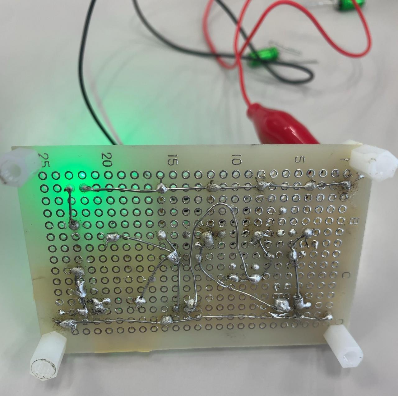本日は技術体験研修で、はんだ付けを行い電気回路を作成し、オシロスコープで回路の計測をしました。作成した回路の配線が複雑になってしまったことが反省点です。最初に回路を作成したときに求めていた結果を得ることはできませんでした。配線が複雑だったことで、はんだ付けを行う時間も多くかかってしまい、どこが原因なのかを見つけることも大変でした。これらのことから、効率の良い手順を踏めるようにするためにも複雑にならないようにして、原因を早期発見できるようにすることが重要なのだと学びました。初めての実習課題であり、製作から検証までの流れの雰囲気も掴むこともできました。