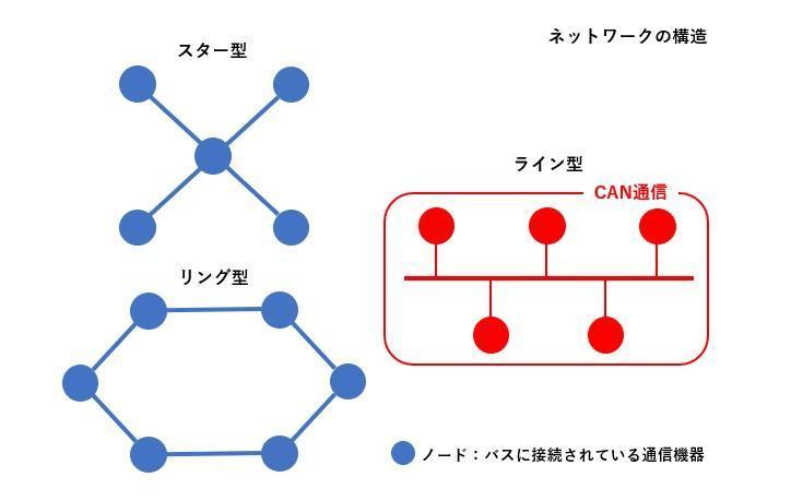 配属後に必要となる技術知識の学習として、CAN通信の基礎知識である「ライン型構造」について調べてみました。ネットワークに接続される通信機器は「ノード」と呼ばれ、車載ネットワークの場合は電子制御ユニット(ECU)がノードとなります。ネットワークを実現する方式には「スター型」や「リング型」などがありますが、CAN通信は「ライン型」を採用しています。ライン型はバスに各ノードを接続してネットワークを構成するため、設計が非常にシンプルです。車載ネットワークには複雑な配線を解消するという目的があるので、この構造はその目的に合っていると理解できました。