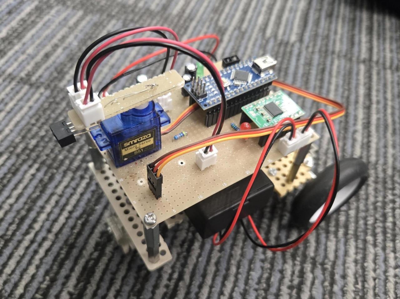 前回作成した自走車の改善に取り組み、その基板の作成を行いました。先週の時点で配線図の作成を終え、部品の配線をスムーズに進めることができました。しかし、今回新たに追加した要素である障害物検知用の赤外線センサーとサーボモーターが思うように動作せず、何度も配線をやり直すことになってしまいました。