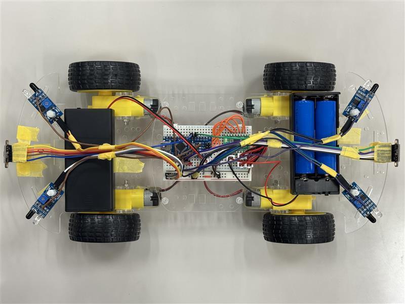 現在、自走車の設計・製作に取り組んでいます。自走車には4つの赤外線センサーと2つのLiDARセンサーを搭載し、周囲の障害物を検知できるようにしました。これらのセンサーから取得した値をもとに、自走車を自由に動作させるプログラムを作成しています。6つのセンサーを考慮したプログラムの開発は、プログラミング経験があまりない私にとって難しく、正常に動作させるまでに苦戦しました。それでも、試行錯誤を重ねて思い通りに動かせたときには、他の研修では味わえない達成感があり、とても楽しく作業に取り組めています。今後も失敗はあると思いますが、楽しむことを忘れずに研修に取り組んでいきたいです。