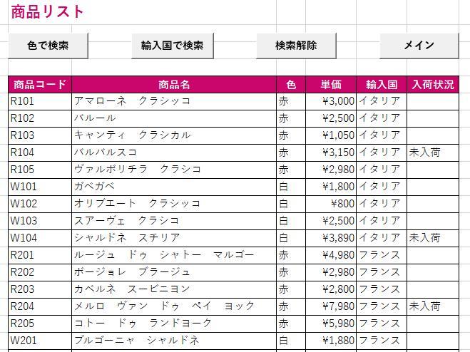 今回はVBAを使って商品リストの検索機能を作成しました。色や輸入国を条件に商品を絞り込むことができ、さらに「検索解除」ボタンを押すと元の全商品リストに戻すことができる機能としました。画面上部には「色で検索」「輸入国で検索」「検索解除」「メイン」のボタンを配置し、操作性を重視し設計しました。